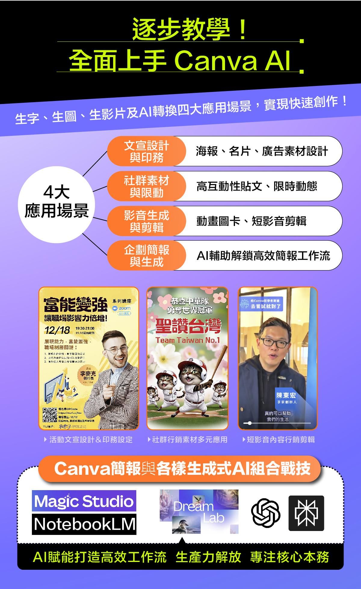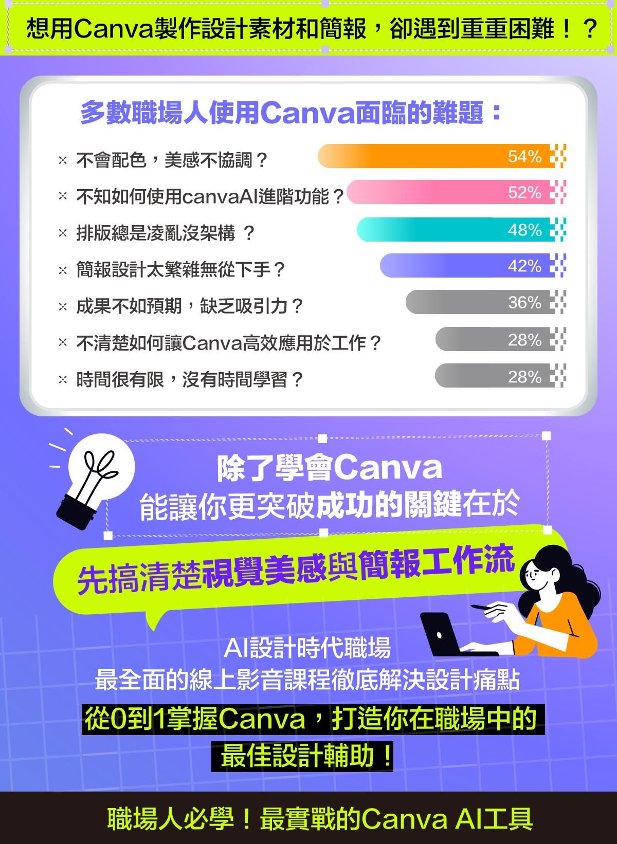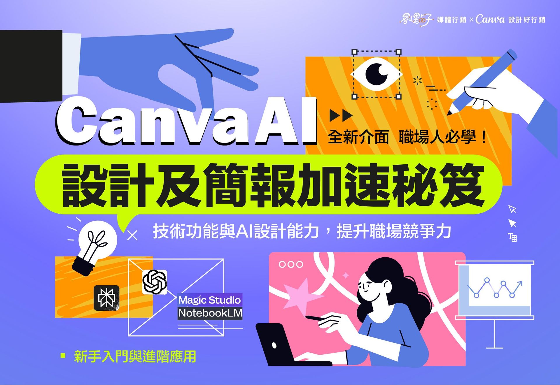 本課程專為職場人士設計,聚焦於 Canva 最新 AI 工具的應用與高效設計技巧。從基礎到進階,學員將學習如何使用 AI 提升簡報與設計的專業性,打造具吸引力的視覺作品。以全新 Canva 介面與 AI 工具為核心,本課程針對新手入門及進階應用,提供職場競爭力提升的實用技能。