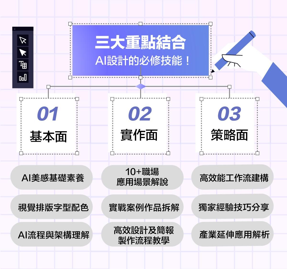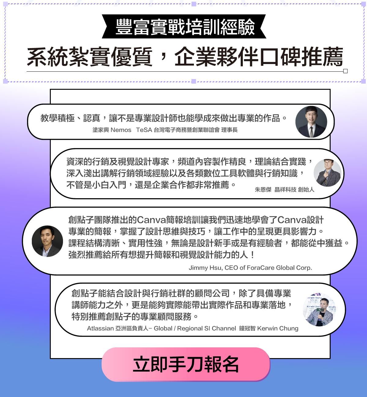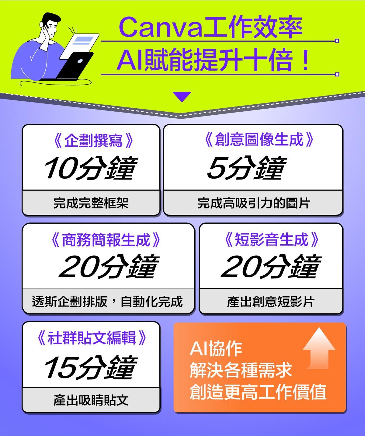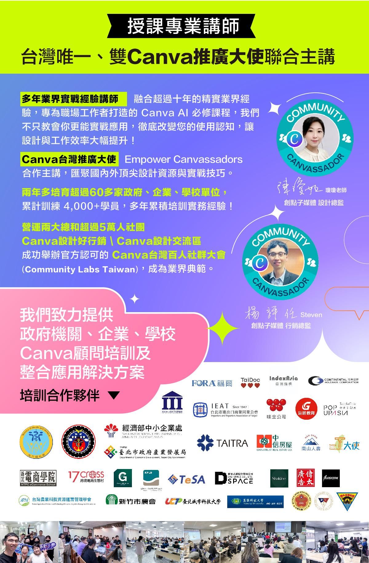 本課程專為職場人士設計,聚焦於 Canva 最新 AI 工具的應用與高效設計技巧。從基礎到進階,學員將學習如何使用 AI 提升簡報與設計的專業性,打造具吸引力的視覺作品。以全新 Canva 介面與 AI 工具為核心,本課程針對新手入門及進階應用,提供職場競爭力提升的實用技能。